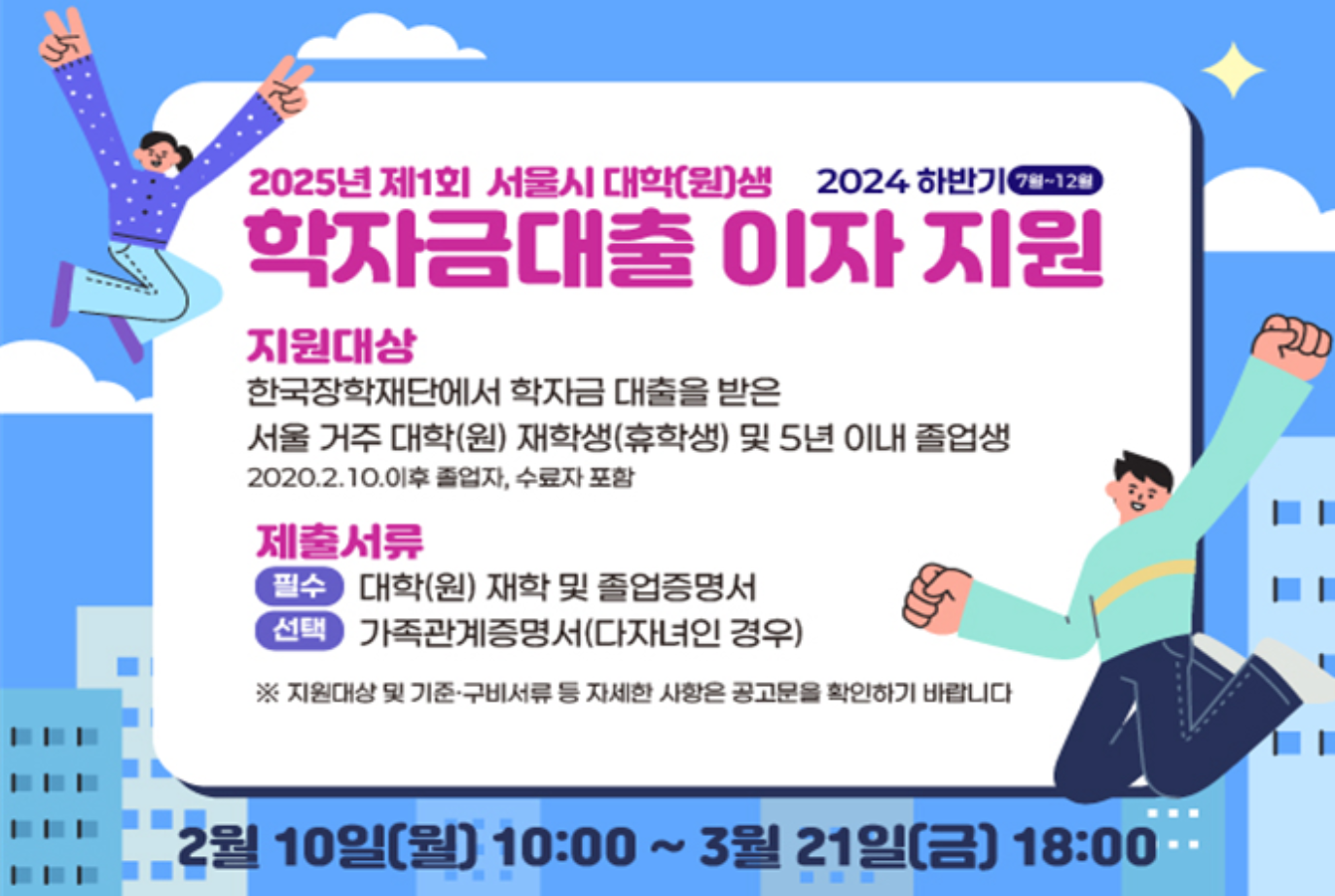 영주시, '2025년 하반기 대학생 학자금대출 이자 지원 사업' 신청 접수광주시, 지역청년 학자금 대출 이자 “전액 지원”광주시, 학자금 대출 이자 전액 지원[인천TV] 인천시, 학자금대출 이자 지원 소득제한 폐지... 8월 4일부터서울시, 학자금 대출 이자 지원…39,000명 대상대구시, 대학생 학자금 대출 이자 지원